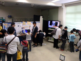11月7日(土)~8日(日)に第49回高専祭が開催されました。電気工学科展では、電気技術研究会メンバーを中心とした学生が作製した「レーザープロジェクタ」や「EVバギー用モータ制御回路」、「旗揚げロボット」の展示、「超伝導」や「環境と電気の関わり」に関するデモ実験と展示、そして1年生が電気電子工学入門の調べ学習で作成したポスターの展示などを行いました。学生は、試行錯誤を重ねながら制作や準備に取り組んでおりましたので、ご来場いただいた方々に楽しんでいただき、また多くのコメントやアドバイスをいただけたことを喜んでおりました。